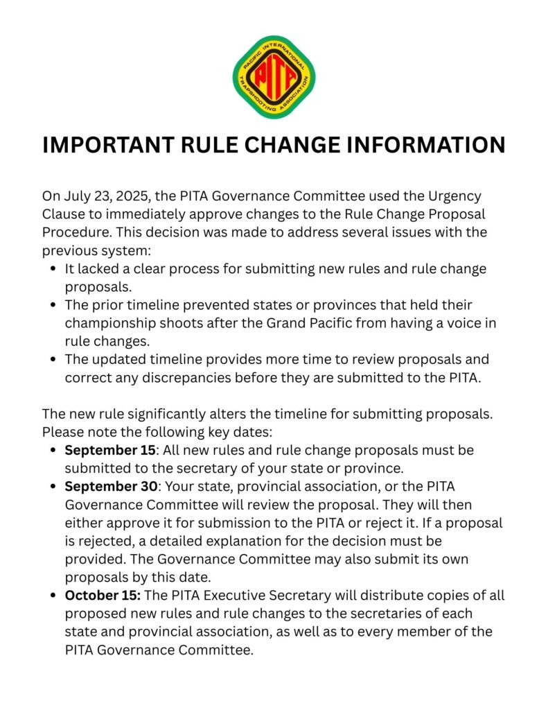 Rules changes/additions must be received by September 30th to be considered at the following year’s Rules Committee Meeting (usually held during the Grand Pacific).